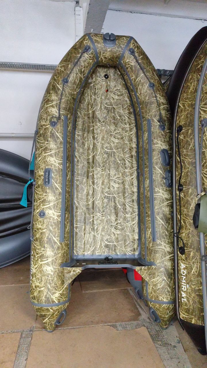 Лодка Адмирал 330 НДНД - килевая лодка с U-образной формой баллонов под мотор до 18 л.с. Вместимость - 5 человек. Легкий выход на глиссирование, низкая парусность, высокая курсовая устойчивость. Помимо надувного дна низкого давления, на лодке уже установлены ручки для переноски, рым-кольцо, сливной клапан, комингсы и усиление по днищу и транцу.